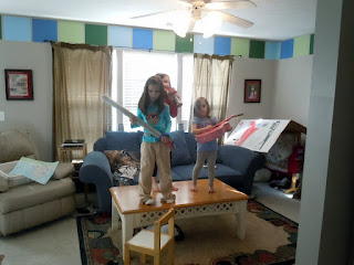 Speaking of camping, with Mike out of town, Skylar and I had our 2nd annual “No Boys Allowed Party.” She had two little friends who came and spent the night. They painted and dressed up and played and watched a movie and ate popcorn and built a fort. They all had sleeping bags and ended up staying asleep in the fort all night long. I was impressed, especially since it was in my bedroom. Ha! They had a blast! We topped off the next morning with some sliding down the stairs and a dance party for good measure. Fun was had by all. In fact, I can’t wait to do it again next year.