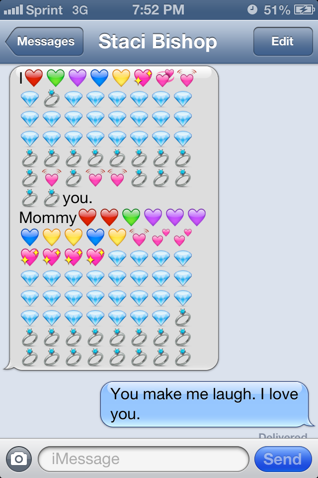 Mike just wrapped the “Boat Show” at his work, which kept him pretty busy. They did really well and Mike even won a few gift card incentives for sales. I just got back from a 3-day road trip with my dad. He’s in outside sales and I used to ride along with him when I was younger but then marriage and a little girl happened so I haven’t been in a while (ahem, about 10 years). We had a nice little visit down to Mobile, AL and over to Baton Rouge, LA and then up through Jackson, MS before heading back home. We even took a little detour by my freshman college dorm. Let me tell ya, THAT was quite a surreal moment. It was a good trip and I hope that we can do it again next year. The iPod birthday gift came in handy while I was gone. I taught Sky how to text and FaceTime and she caught right on. It was fun to keep in touch everyday, especially since she spells phonetically. Some of her texts were hilarious including when she found the emoticon keyboard.