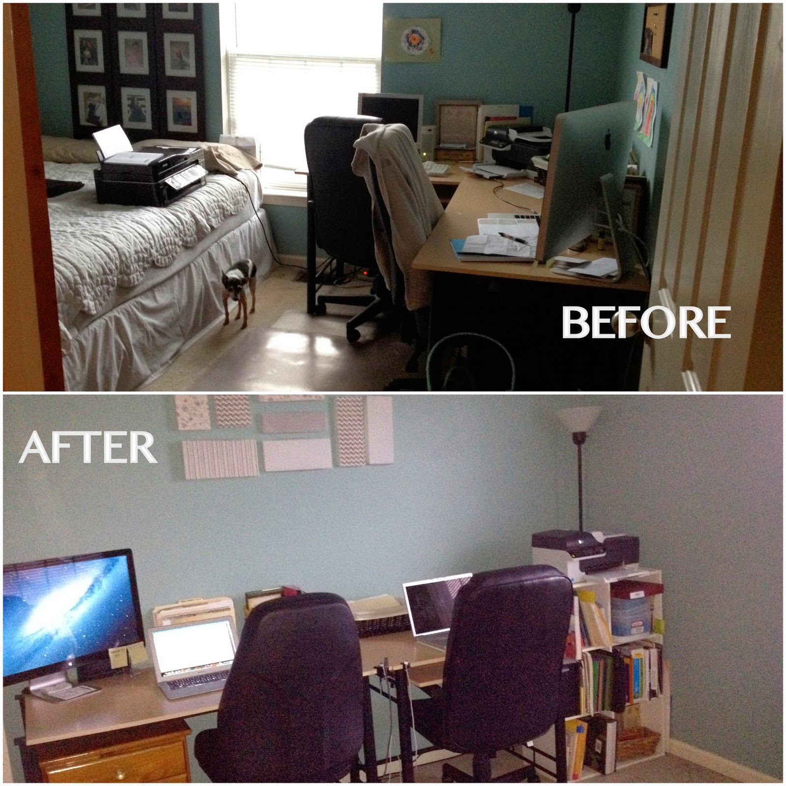 Previously when you walked into the room you saw my workspace, which was an L-shaped desk. There was a large bookcase to your immediate left and a queen-sized bed was in the left corner.