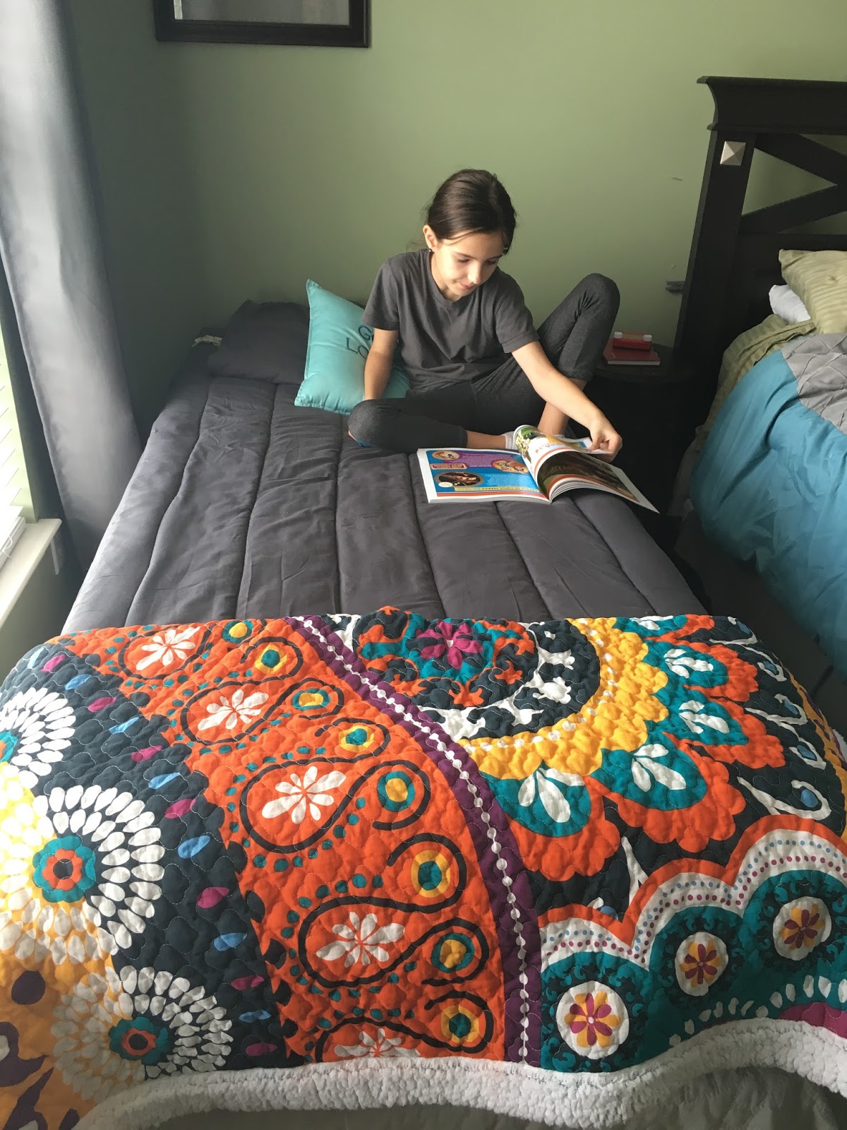 This kid loves hanging out reading books on her bed. She received new Zip It Bedding and this beautiful Sherpa Blanket for Christmas!