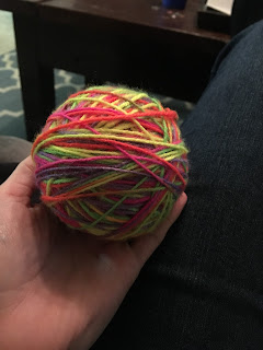 I started with a VERY tangled up skein of yarn that I untied and worked into a ball for my friend Cate. I actually found it rather therapeutic. Who knew?