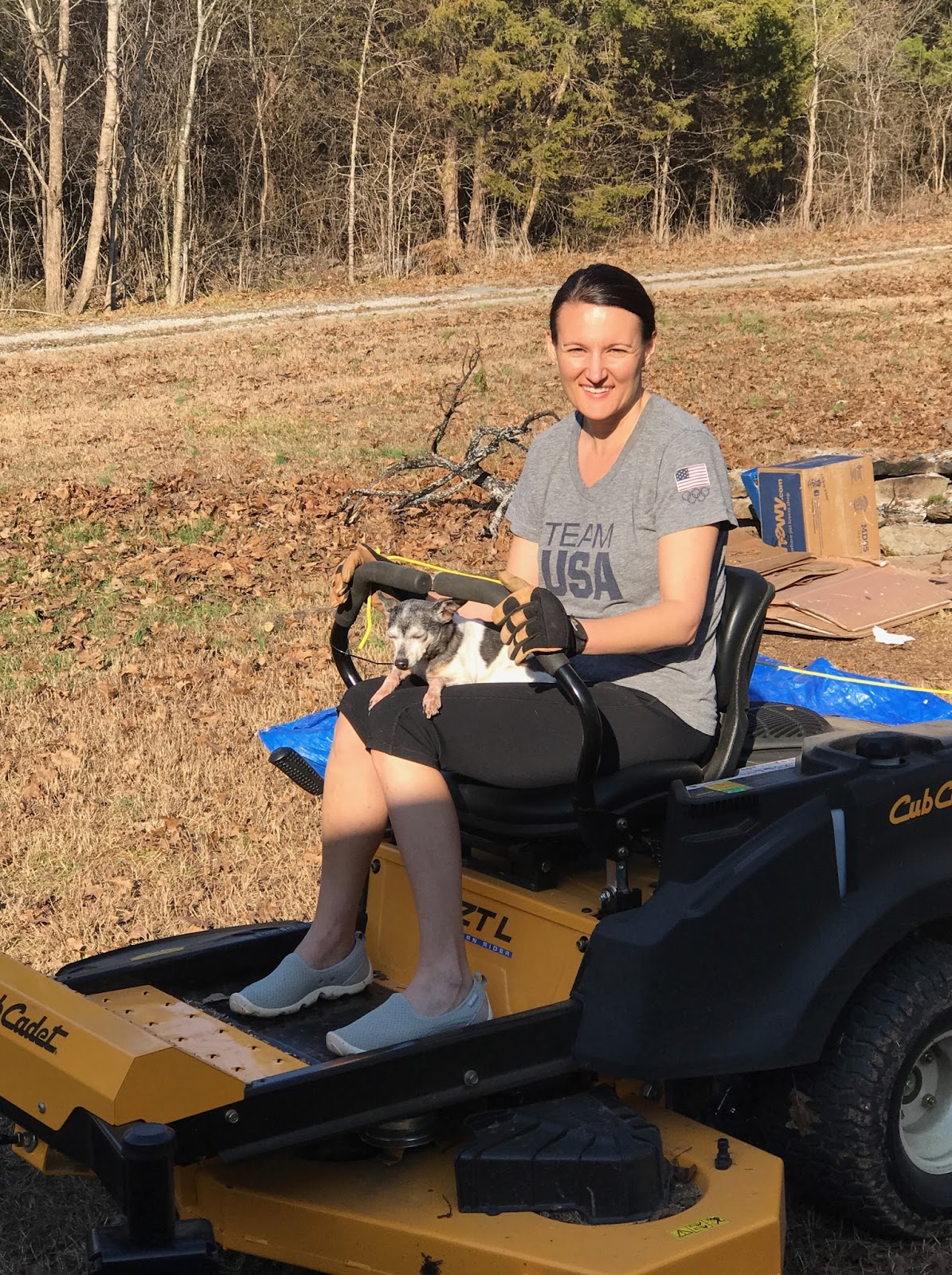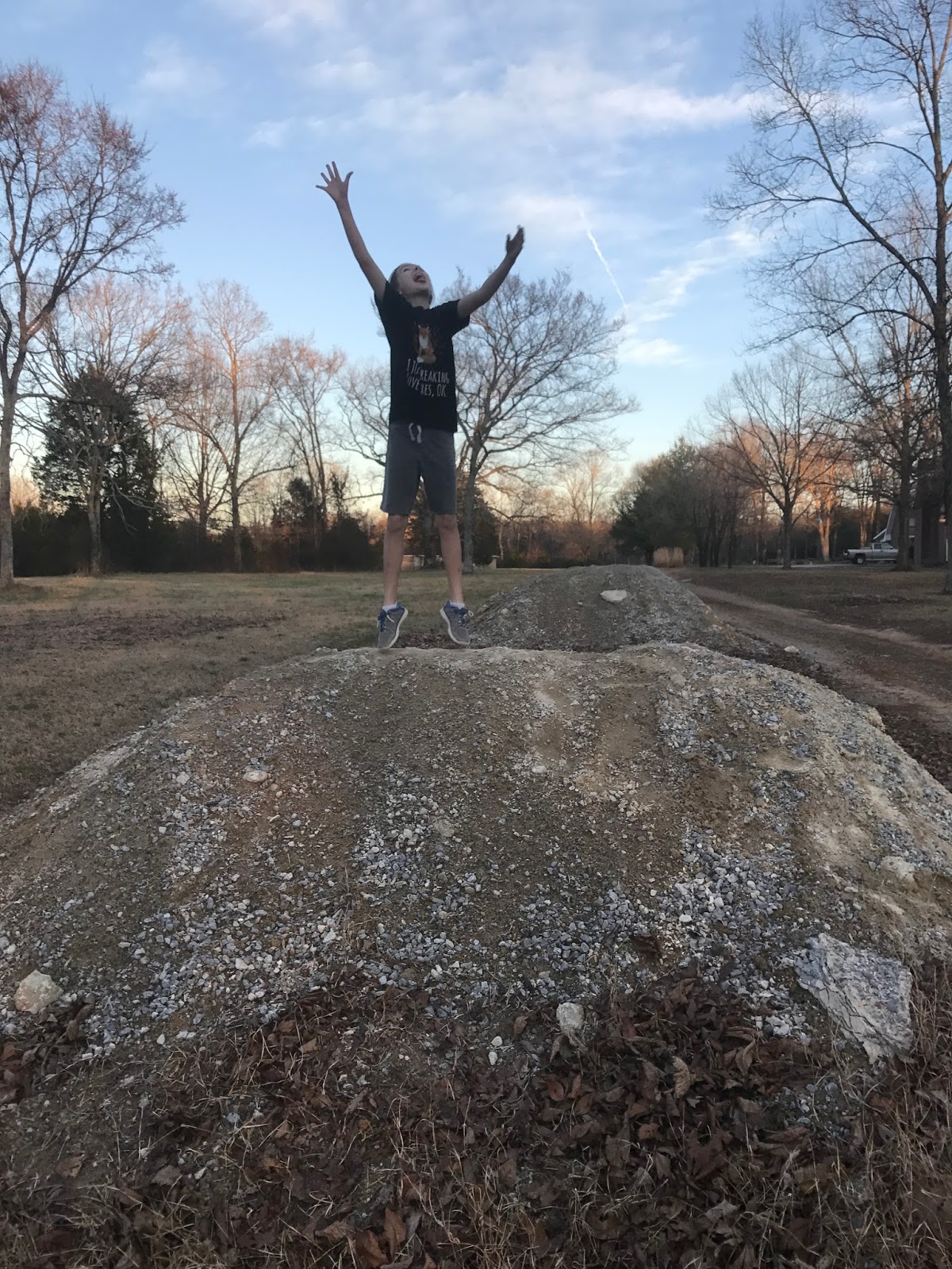 Me and Easton using the lawn sweeper to collect leaves for the garden.